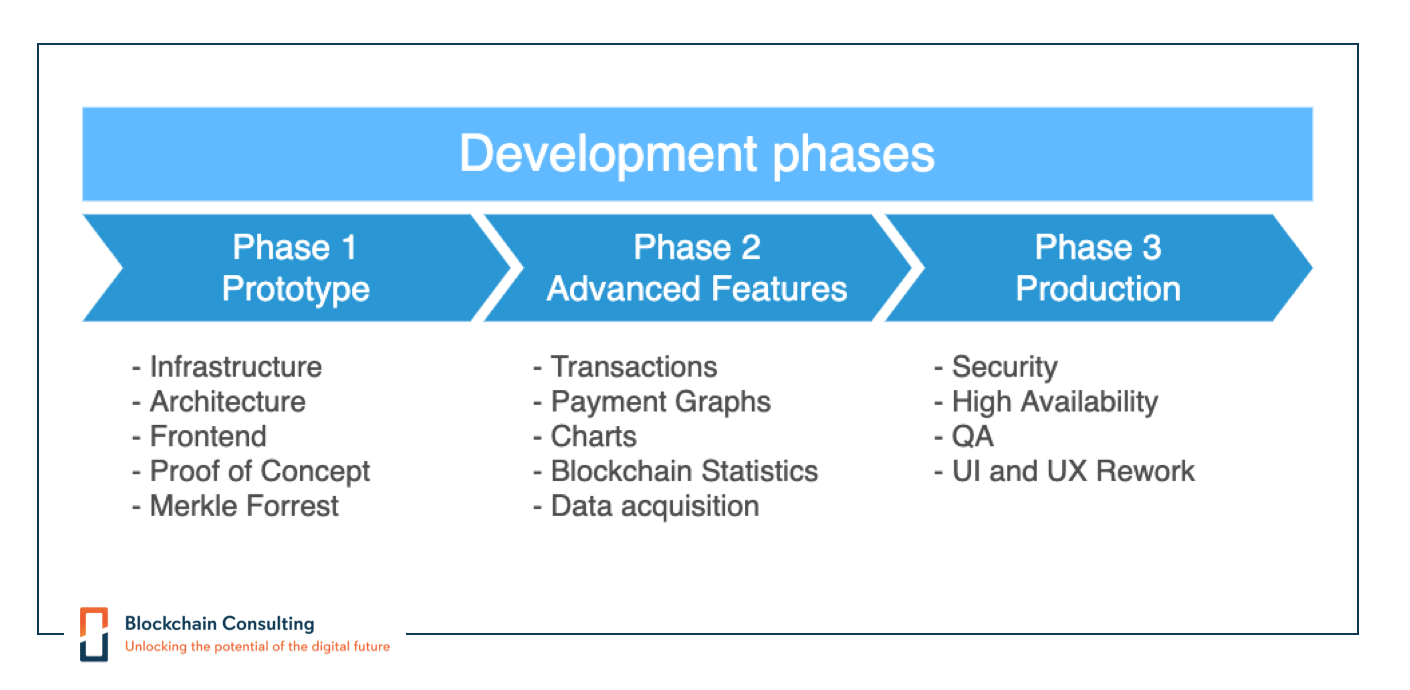 These Blockchain clients, which represent the basic backbone of the application, must be updated as soon as a new release is available. This is challenging because new versions are released frequently, and often at short notice. To minimize potential sources of error, we designed the Block Explorer in such a way that it does not rely on additional external sources. It relies directly on blockchain nodes to provide blockchain data. The correct operation was ensured by monitoring all nodes permanently. For this first phase, we involved software developers and a senior technical architect. After we considered different possible base architectures, we decided to go with a microservice architecture based on the containerization of each microservice.