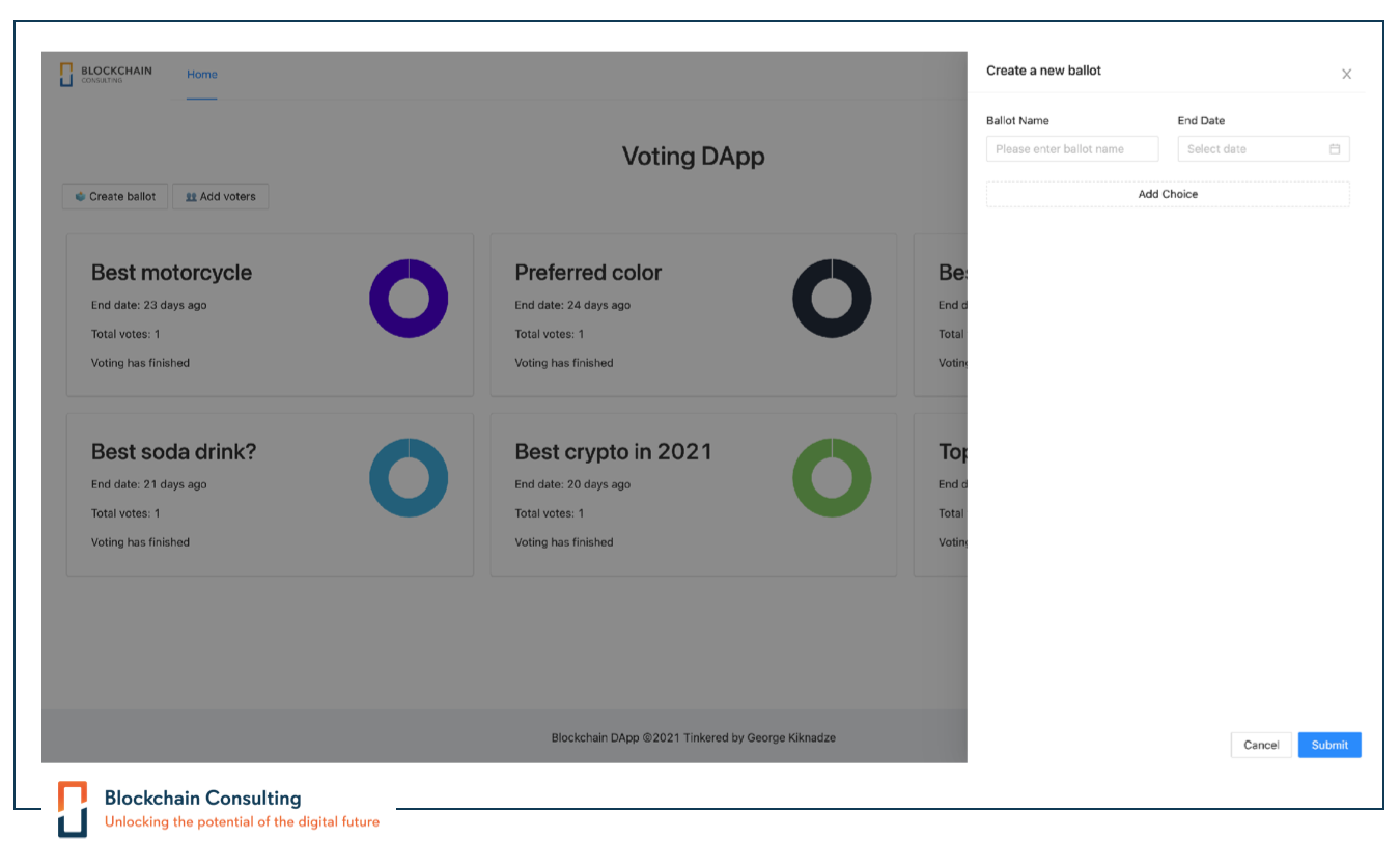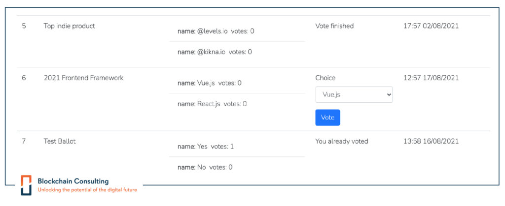 Voting is a fundamental right of citizens who live in a democracy. We at Blockchain Consulting were approached several times to evaluate voting systems. Despite the obvious advantages of using blockchain for voting, there are also some problems such as vote privacy. For years, people have been struggling to find workarounds for these downsides, and it still remains hard to find solutions. In 2021, we decided to develop our own voting application and to use it for in-house purposes. Our goal was to find solutions to some of the problems that could not be solved yet.
